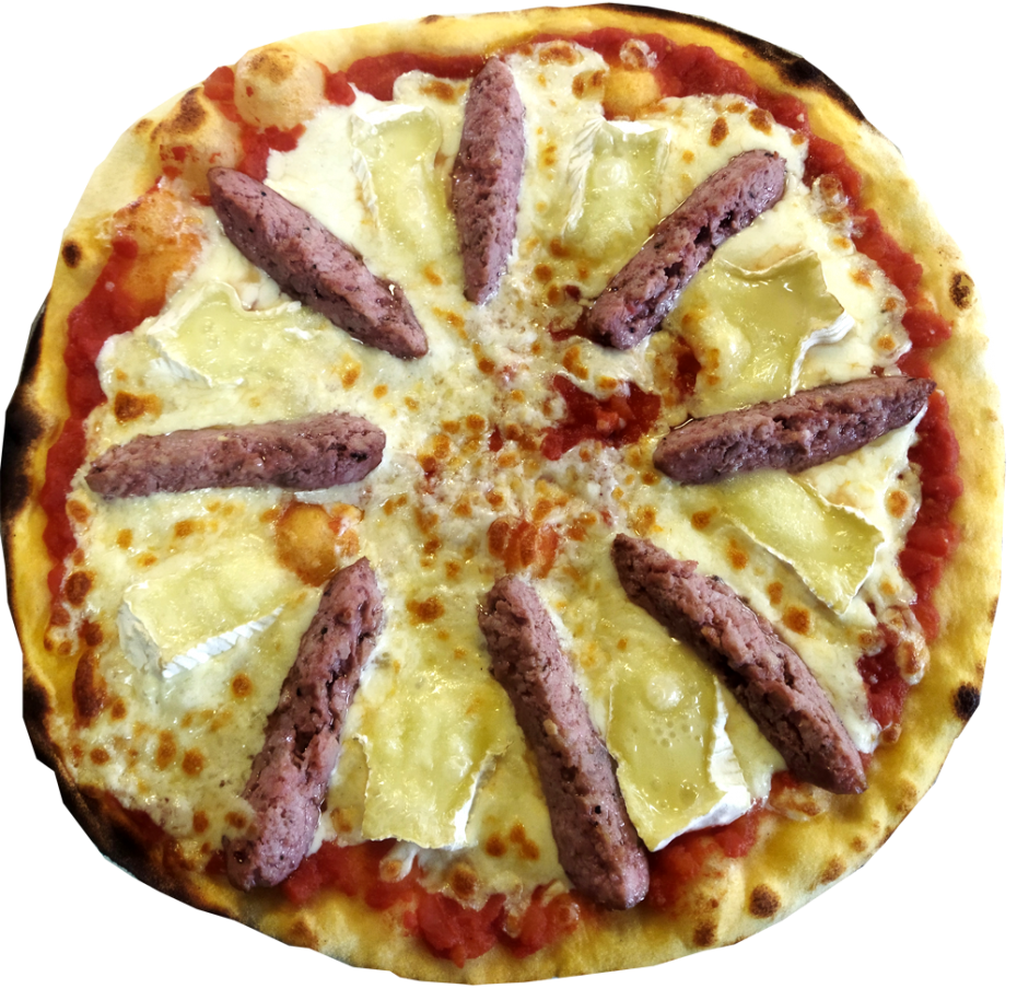 Sauce tomate, mozzarella, Perugini et Camembert.